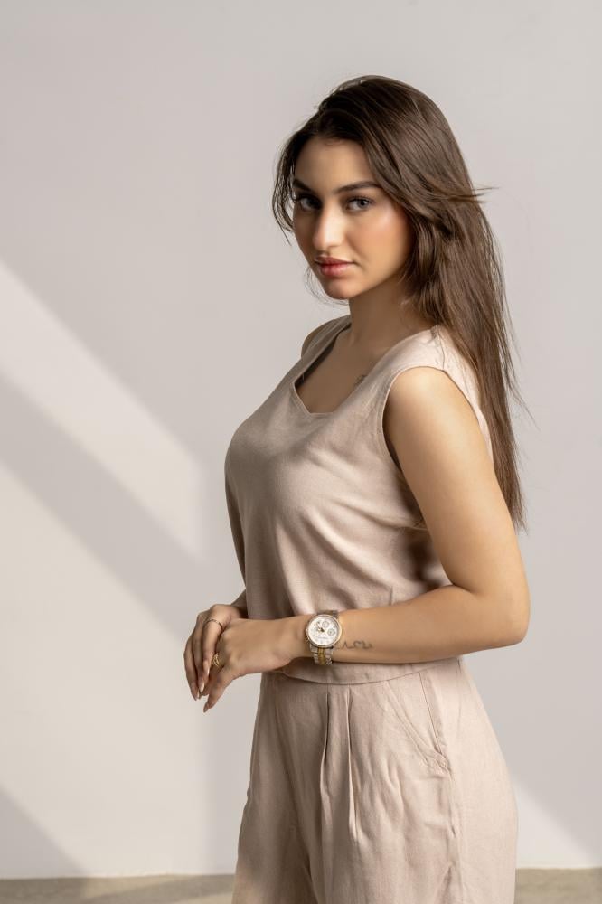 ☀️ الخامات خفيفة ومناسبة لأيام الصيف الطويلة، سواء على الشاطئ أو في النزهات الخارجية. اللون البيج الناعم يمنحك إحساسًا بالانتعاش والهدوء ويكمل أناقتك في كل لحظة.