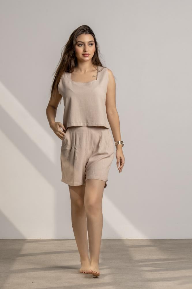 نتجًا صيفيًا ساحرًا يجمع بين الأناقة والراحة. يتكون من بلوزة بدون أكمام تتميز بفتحة رقبة على شكل مربع، مما يضفي لمسة عصرية ومتميزة على إطلالتك. يتناغم مع ذلك شورت قصير مزود بمخابي جانبية، مما يوفر لكِ سهولة في الاستخدام وراحة خلال الأيام الحارة.